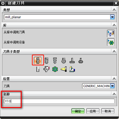 1、在机床视图插入一把铣刀,例如要创建一把10MM的燕尾刀,名称可以使用Y10。如下图所示: