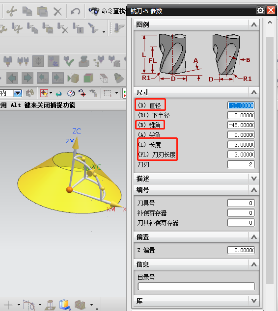 2、打开刀具【参数】,要设置的参数有【直径】、【锥角】、【长度】、【刀刃长度】,刀具直径为10MM,锥角为-45度(这个按照你要加工的槽角度来创建),长度与刀刃长度各为3MM(这个按照加工的槽深度设置),