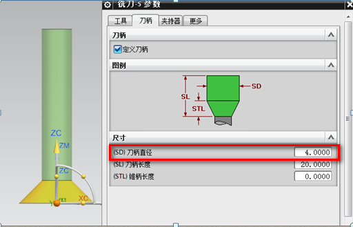 3、刀具参数设置好后,要继续设置刀柄参数,因为我们设置的锥角是45度,刃长3MM,所以两边互为对称, 10MM直径减去6MM,得到刀柄就是4MM,选择【刀柄】--【尺寸】,设置刀柄参数,如下图所示: